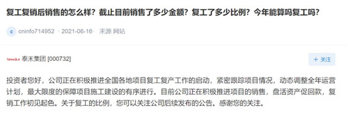 6月18日,有投資者在投資互動(dòng)平臺(tái)上向泰禾集團(tuán)咨詢關(guān)于復(fù)工復(fù)銷后銷售情況等問(wèn)題。對(duì)此,泰禾方面回應(yīng)稱,公司正在積極推進(jìn)全國(guó)各地項(xiàng)目復(fù)工復(fù)產(chǎn)工作的啟動(dòng),緊密跟蹤項(xiàng)目情況,動(dòng)態(tài)調(diào)整全年運(yùn)營(yíng)計(jì)劃,最大限度的保障項(xiàng)目施工建設(shè)的有序進(jìn)行。目前公司正在積極推進(jìn)項(xiàng)目的銷售,盤活資產(chǎn)促回款,復(fù)銷工作初見(jiàn)起色。(中國(guó)房地產(chǎn)網(wǎng))