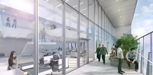 而在建筑設計上,也為打造社區環境提供新式空間組合。打破以往大平層辦公室的設計思路,加裝挑空的陽臺、挑空的室內共享空間,在打通空間、為空間帶來靈動性的同時,也可以為企業員工帶來辦公+生活的新體驗。