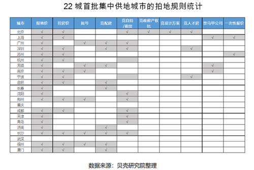 此前,南京在首次集中供地后,就約談房企,評估裝修、人工等指導意見。而從已完成首輪集中供地的城市來看,土拍規則大致分為兩類:一是控總價,就是溢價率直接封頂;二是在封頂之后,通過搖號、報配建、共有產權房、自持比例等來決定由哪家房企最終獲得地塊。