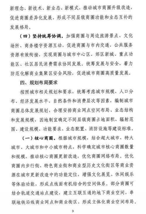 《指南》提出堅持總量控制。根據城市經濟發展水平、人口規模和消費升級需求,結合城市相關規劃,合理確定城市商圈總體規模,優化網絡布局,完善服務功能。對城市中心區商業過度飽和的商圈實行商業設施規模總量控制,嚴格控制新建、擴建商業建筑規模。重點補齊社區商業發展短板,促進城市商業適度均衡發展。