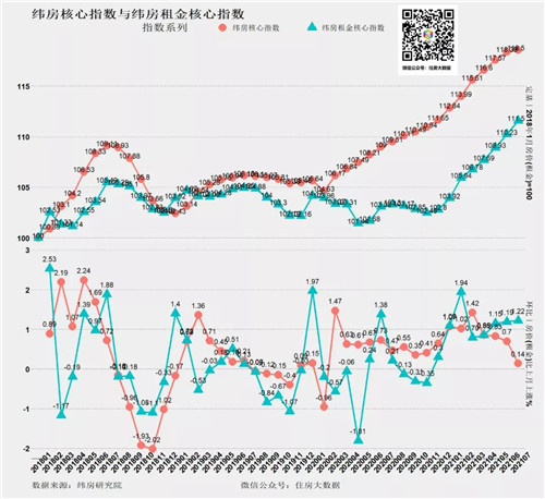 反映全國24個核心城市綜合房價漲跌的緯房核心指數監測顯示,2021年7月,核心城市房價環比上漲0.14%,漲速比6月下降0.56個百分點。房價總體趨于平穩。與2018年1月相比,核心城市綜合房價上漲了18.5%。