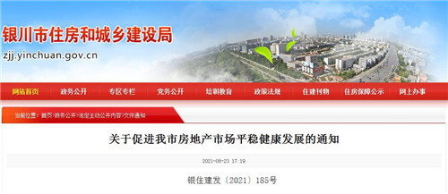 房訊網訊 8月23日,銀川市住建局聯合其他十一家政府部門發文,出臺了《關于促進我市房地產市場平穩健康發展的通知》,即日起施行。