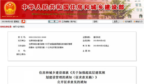 房訊網訊 為貫徹落實新發展理念,統籌發展與安全,轉變城市開發建設方式,科學規劃建設管理超高層建筑,促進城市高質量發展,9月10日,住房和城鄉建設部官網發布《關于加強超高層建筑規劃建設管理的通知(征求意見稿)》,向社會公開征求意見。