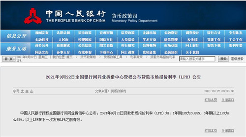 房訊網訊 9月22日,中國人民銀行授權全國銀行間同業拆借中心公布,9月貸款市場報價利率(LPR)出爐:1年期LPR為3.85%,5年期以上LPR為4.65%。以上LPR在下一次發布LPR之前有效。據悉,自2020年4月至今,LPR已經保持17個月不變。