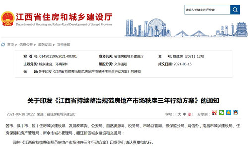 房訊網(wǎng)訊 9月18日,江西省住建廳印發(fā)《江西省持續(xù)整治規(guī)范房地產(chǎn)市場秩序三年行動方案》的通知,決定在全省范圍內(nèi)開展持續(xù)整治規(guī)范房地產(chǎn)市場秩序三年行動。