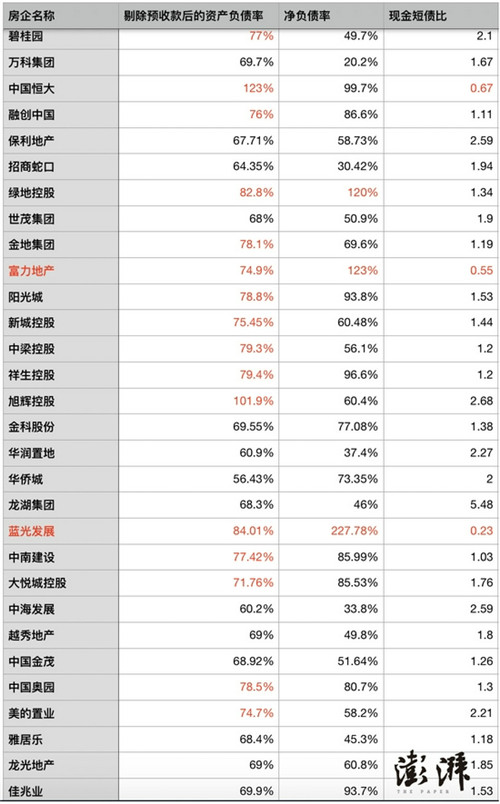 澎湃新聞根據30家上市房企2021年半年報披露的“三道紅線”情況做了數據整理,發現多家房企都正在努力讓自身進入“綠檔”安全區。
