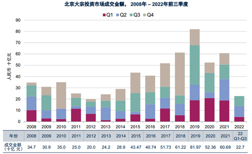 北京大宗投資市場在三季度的整體表現較為平穩,完成了若干宗投資交易,該季度投資市場累計成交金額約88.9億元。前三季度,北京大宗投資市場相較往年仍然低迷,累計成交金額約226.85億元,較去年同期下降55.2%。預計2022年四季度北京大宗投資市場仍然波瀾不驚,賣方與潛在買家仍處于博弈的階段,賣方希望加速拋售資產進行變現,但潛在買家會謹慎出手且對可售項目進行仔細甄別。此外,自用型收購及通過法拍渠道購得資產有可能在年末進一步增加。