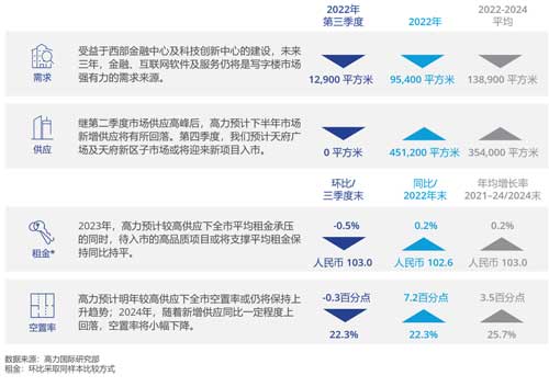 高力預計明年全市平均租金或將同比持平。一方面,考慮到2023年仍將有超30萬平方米的新增供應入市,一定程度上平均租金將承壓;另一方面,待入市項目中不乏有位于核心區域的高品質項目,或將支撐全市平均租金保持穩定。