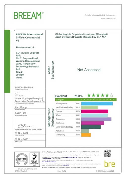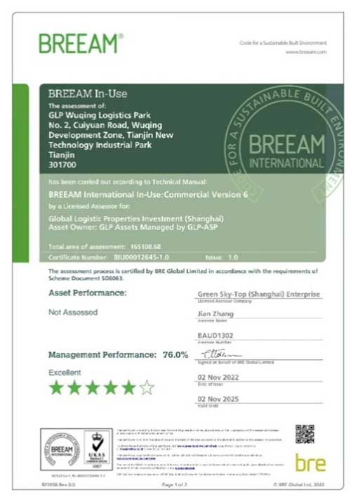 普洛斯武清物流園獲BREEAM In-Use“卓越”級認證