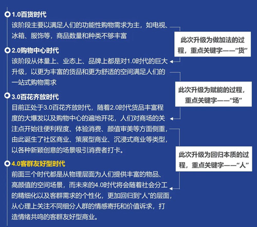 高力國際通過縱觀零售商業的發展史以及近年來出現的零售商業熱點,總結出零售商業經歷的幾大發展階段,以及未來的發展趨勢,每個階段的升級都是圍繞“人、貨、場”三個關鍵字,但每一次升級的重點有所不同: