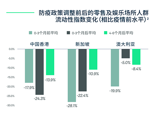 2、疫情前水平為谷歌人群流動性數據2020年1月3日至2月6日五周時間的中間值。中國香港、新加坡及澳大利亞防疫政策調整時間分別為2022年3月15日、2021年8月1日及2021年11月11日。