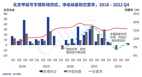 四季度北京再度受到疫情的影響,但無法阻止北京甲級寫字樓市場需求的結構性恢復,第四季度市場凈吸納量已經轉正,達到4.2萬平方米,符合預判。