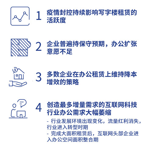 在沒有新增供應壓力的情況下,市場行情出現快速反轉,部分子市場空置率出現大幅上升主要是由于需求不足和退租面積增多所致。影響2022年市場需求走勢的四個核心因素: