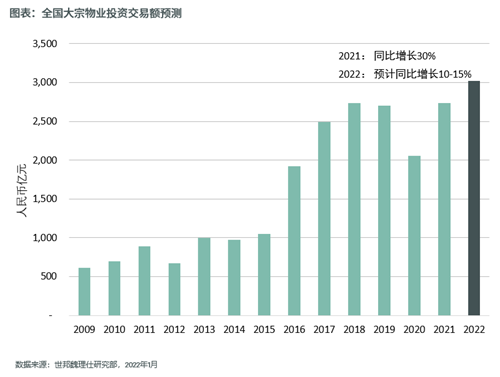 而在投資市場,世邦魏理仕數據顯示2021年中國大宗物業投資市場迎來快速復蘇,總成交額達到2730億元人民幣,同比上漲33%。展望2022年,在投資和出售意愿均有所提升的環境下,世邦魏理仕預計中國內地商業地產大宗交易額將同比增長10%-15%,有望首次突破3000億元人民幣。