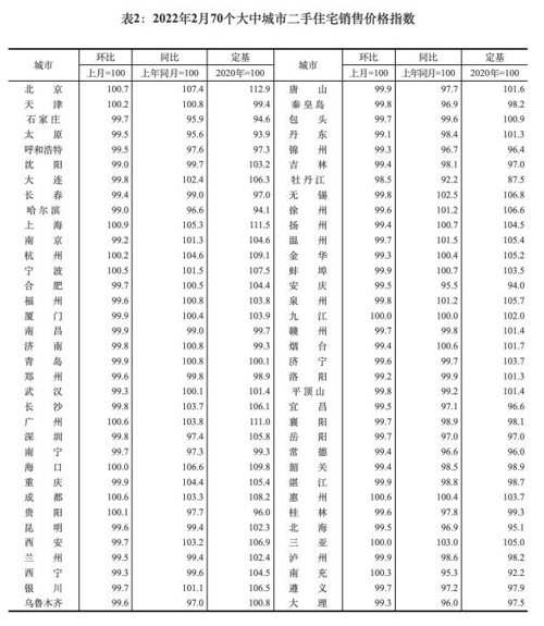 2022年2月70個大中城市新建商品住宅銷售價格指數。截圖自國家統計局官網