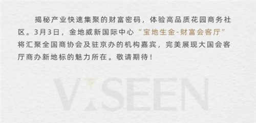 3月3日,由金地威新國際中心與房訊網聯合主辦的“財富會客廳”活動將在項目盛情上演,來自全國各省、地市商會及駐京辦等機構的十余名嘉賓將走進項目,對金地威新國際中心進行實地考察,近距離感受北京南城產業新地標的快速崛起,領略22萬平米花園商務社區中無界辦公的魅力。