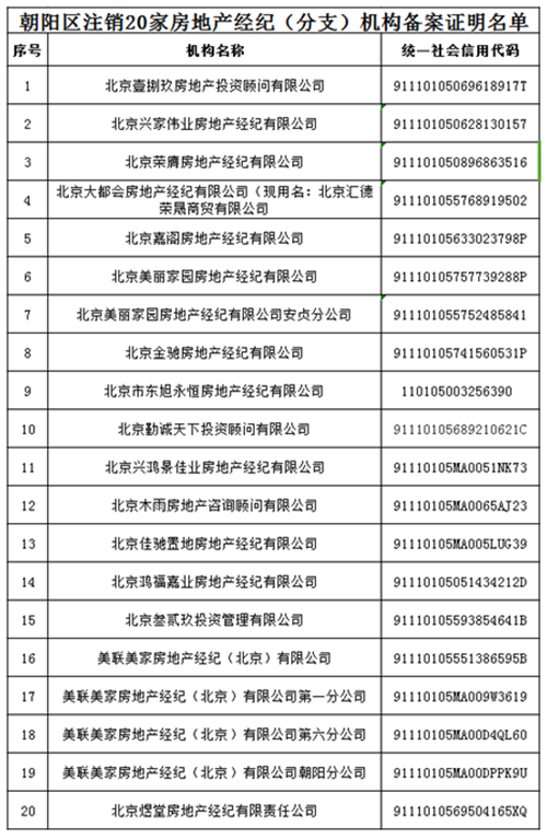 朝陽區注銷20家房地產經紀(分支)機構備案證明名單: