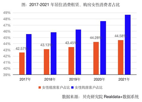 3月7日,貝殼研究院發布的《女性居住消費調查報告2022》顯示,從租、購消費趨勢看,女性消費者占比連續5年呈上升趨勢。