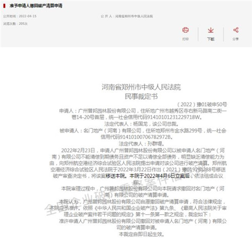 4月15日,全國企業破產重整案件信息網最新發布《河南省鄭州市中級人民法院民事裁定書》!恫枚〞凤@示,廣州普邦園林股份有限公司撤回對名門地產(河南)有限公司的破產清算申請。