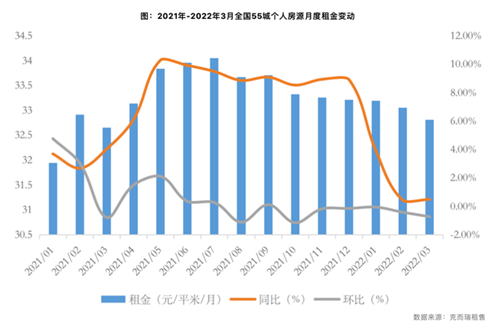 4月15日,據克而瑞租售監測數據顯示,2022年一季度,全國55城個人房源租金為33.02元/平方米/月,環比下跌0.72%,同比上漲1.6%,較2021年整體來看,租金上漲幅度明顯下降。