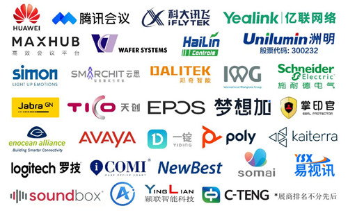 參展商包括華為、科大訊飛、IWG-International Workplace Group、MAXHUB、騰訊會議、施耐德電氣、西蒙電氣、羅技、海林、億聯、新柏石、EnOcean聯盟、威思客、夢想加、目視、邦奇、Poly、云思、iComi、Jabra、Avaya、搜麥、一錠、視聲、原點生活、迭智、洲明、音珀EPOS、穎聯智能、天創等。