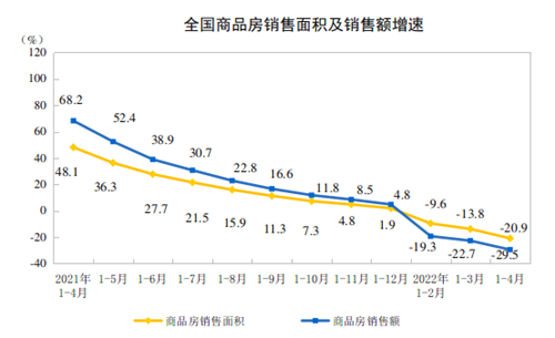 1—4月份,商品房銷售面積39768萬平方米,同比下降20.9%;其中,住宅銷售面積下降25.4%。商品房銷售額37789億元,下降29.5%;其中,住宅銷售額下降32.2%。
