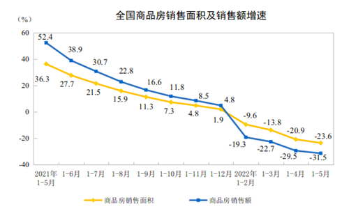 前5個(gè)月,全國(guó)商品房銷售額48337億元,下降31.5%;其中,住宅銷售額下降34.5%。