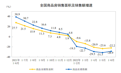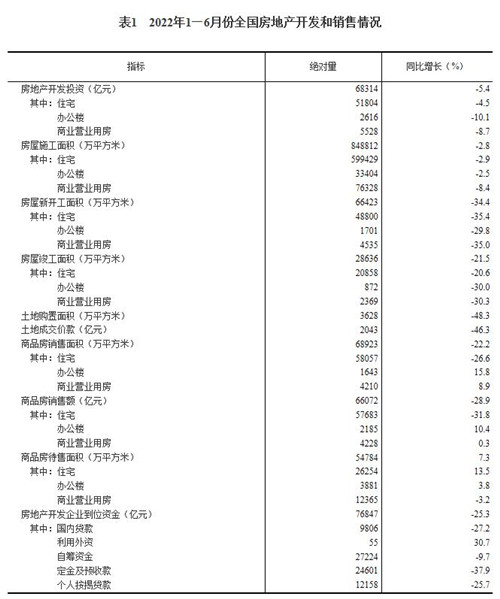 1—6月份,商品房銷售面積68923萬(wàn)平方米,同比下降22.2%;其中,住宅銷售面積下降26.6%。商品房銷售額66072億元,下降28.9%;其中,住宅銷售額下降31.8%。