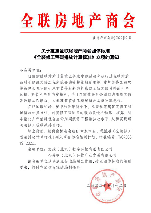在綠色、節能、低碳、健康的產業發展大背景下,在全聯房地產商會的指導下,全裝聯(北京)科技產業發展有限公司、友綠(北京)數字科技有限責任公司聯合推動的《全裝修工程碳排放計算標準》于2022年7月12日成功立項,標準編號為:T/CRECC19-2022。本標準旨在規范建筑裝飾裝修工程碳排放計算方法,幫助項目裝飾裝修工程的碳排放預算、核算。