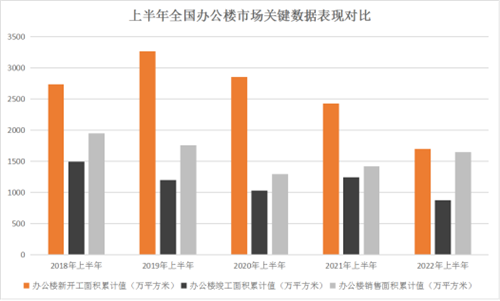 新開工面積2022年上半年為1701萬平方米,與2021年同期相比大幅下降近三成。綜合近三年同期數據來看,自2020年以來,全國辦公樓新開工面積已經連續三年出現下滑,且下降幅度呈現擴大的趨勢,分別為12.6%、15%、29.8%。