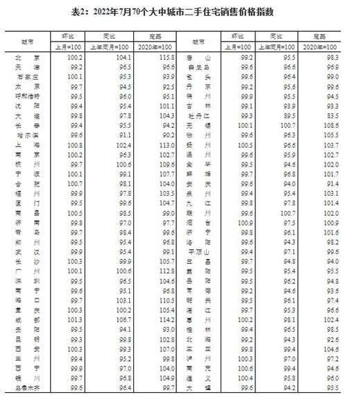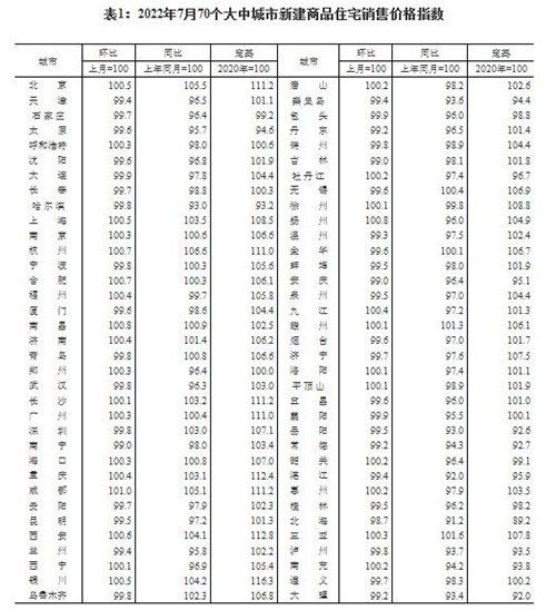 房訊網訊 2022年7月份,70個大中城市中商品住宅銷售價格下降城市個數略增。一線城市商品住宅銷售價格環比微漲、同比漲幅回落,二三線城市環比整體呈降勢、同比降幅擴大。