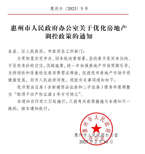 廣東惠州:商品住房限售年限由3年調整為1年