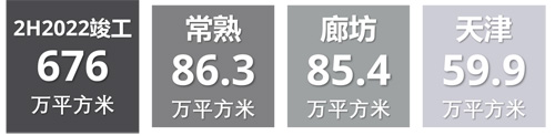 2022年下半年竣工面積最大的城市為常熟,達(dá)86.3萬(wàn)平方米,廊坊以85.4萬(wàn)緊隨其后,這兩個(gè)城市都在短期內(nèi)迎來(lái)了大量新增供應(yīng)。