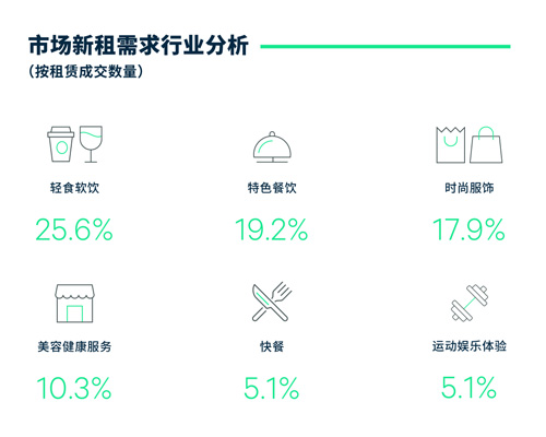 租戶成交方面,餐飲新租戶占據(jù)半壁江山,零售業(yè)態(tài)僅占比三成,而新能源汽車的拓展則有所放緩。在重點(diǎn)關(guān)注項(xiàng)目的新租品牌中,輕食軟飲、特色餐飲、時(shí)尚服飾零售、美容健康服務(wù)、快餐和運(yùn)動(dòng)娛樂體驗(yàn)業(yè)態(tài)位列前六位,占全部錄得成交的83.3%。具體而言,餐飲方面,廣州本地餐飲品牌store by jpg.,PAIX及九毛九旗下慫火鍋繼續(xù)錄得積極擴(kuò)張;而外地來的餐飲品牌費(fèi)大廚、海森堡和Blueglass Yogurt則把首店開在了天河路及越秀區(qū)。零售業(yè)態(tài)方面,本季錄得巴黎香氛品牌DIPTYQUE廣州首店在天河路圍板。新能源汽車本季僅錄得五宗成交,較2022年第四季度有所放緩。就區(qū)域而言,天河路商圈零售業(yè)態(tài)新租占比達(dá)到40.7%,較全市總體水平高10個(gè)百分點(diǎn)。