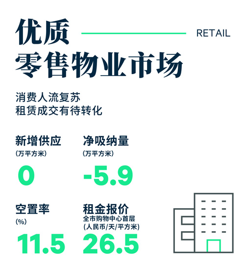 在廣州優(yōu)質(zhì)零售物業(yè)市場(chǎng),第一季度未錄得新增供應(yīng)。需求方面,盡管零售市場(chǎng)顯著復(fù)蘇,但是品牌拓展滯后于人流的反彈和營業(yè)額的恢復(fù)增長(zhǎng)速度,而天河城百貨北京路店的結(jié)業(yè)還帶來了七萬平方米的空置,致使本季全市錄得吸納-59,441平方米,推升空置水平至季末的11.5%,環(huán)比上升0.2個(gè)百分點(diǎn)。而天河路則得益于大面積租戶的開業(yè),空置率下調(diào)至3.1%,環(huán)比減少1.3個(gè)百分點(diǎn)。租金方面,零售市場(chǎng)回暖給予了業(yè)主信心,季內(nèi)租金叫價(jià)止跌回穩(wěn),無漲跌,報(bào)每天每平方米26.5元。