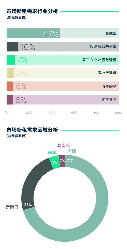 需求方面,金融業憑借占比近半的租賃需求穩居首位。季內河西板塊金融行業集聚優勢突出,銀行、保險與證券等傳統金融機構均有大面積搬遷需求落位,推動板塊內部金融生態不斷完善;與此同時,諸如汽車金融、普惠金融等新興金融業態于各個板塊內標桿項目錄得成交,為南京實現“一核兩翼、多點聯動”的金融中心建設打下堅實基礎。另外,能源轉型的進程提速,驅動以新能源產業為引領的能源及公共事業的租賃需求位居第二,升級搬遷與擴租需求于多個板塊持續放量。后疫情時代,本土商業空間運營品牌依托逐漸提高的靈活辦公接納程度迎來發展新機遇,聚焦新街口核心區位積極布局。房地產建筑中各細分行業租賃需求釋放積極信號,醫美、培訓等多業態消費服務韌性發展,均于新街口及河西有升級擴張之勢。