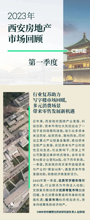 2023年第一季度西安大宗交易市場錄得一筆大宗成交,市場標的愈加多元。目前,雖具備穩定的投資回報及良好升值空間的寫字樓仍是最受歡迎的投資標的,但隨著西安文旅市場的全面復蘇,酒店等新興地產獲得更多關注。同時,隨著近年來西安保障性租賃住房建設進程的加速,政策性住房專營企業在市場上愈加活躍。公寓、租賃住宅等另類資產獲得更多投資機會。隨著資本持續聚焦新經濟地產,標的的多元發展將推動西安大宗物業交易市場活躍度快速提升。