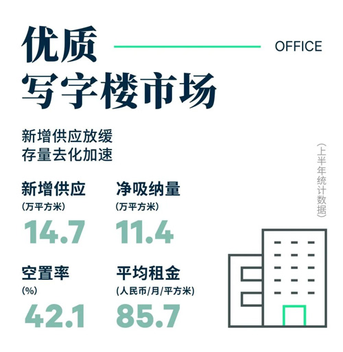 二季度市場仍處于觀望情緒,全市凈吸納量錄得4.8萬平方米,環比下降27.1%,同比下降48.7%。上半年累計凈吸納量錄得11.4萬平方米,同比下降42.4%,其中超過七成來自存量項目去化。新增供應節奏放緩為存量項目爭取更多去化時間。全市空置率小幅上升至42.1%,環比上升0.2個百分點,同比上升0.9個百分點。