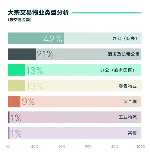 從交易資產類別看,季內兩筆交易為核心商圈品牌酒店且金額占比近八成。核心商圈運營成熟的酒店擁有穩定現金流,區域價值的不斷提升以及項目自身的增值潛力,加上酒店本身多元復合的功能和使用場景,成為吸引投資者進行資產配置優勢的核心優勢。全年來看,資產類別和市場參與者更顯多元化,在可售優質資產增加的推動下,商務園區、零售物業、酒店以及長租公寓三大板塊的占比分別為13%、13%和21%,同比均有明顯上升,擠壓作為傳統主流交易資產類別的商辦類資產占比降至42%。