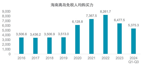 過去四年對房地產(chǎn)市場的深度調(diào)整對中產(chǎn)收入群體帶來了巨大打擊,資產(chǎn)貶值導(dǎo)致的家庭財富縮水也是目前消費復(fù)蘇遲緩的重要原因。以海南離島免稅人均購買力為例,2024年前三季度海南離島免稅人均購買力從2022年8261元/人的頂點下降至5375元/人,降幅高達(dá)35%。