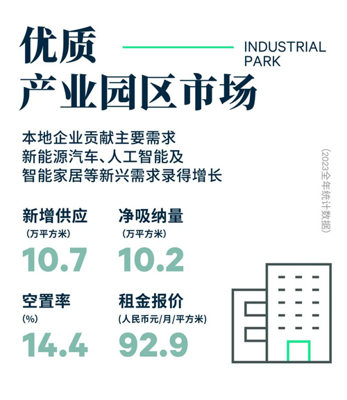 深圳優質產業園市場第四季度需求環比雖有增長,但同比仍有較大差距,單季吸納錄得近3萬平方米。全年錄得兩個新增供應的交付,共計10.7萬平方米,凈吸納量與新增供應量基本持平,同比明顯回落。
