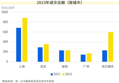2023年全年一線城市成交額約1,640億,占全國成交總額約73%。其中深圳較2022年全年成交總額持平,京滬穗三個城市成交總額較2022年則皆錄得增長,一線城市整體同比漲幅約21%。其中,綜合體及商業(yè)資產(chǎn)的成交同比大幅上升。
