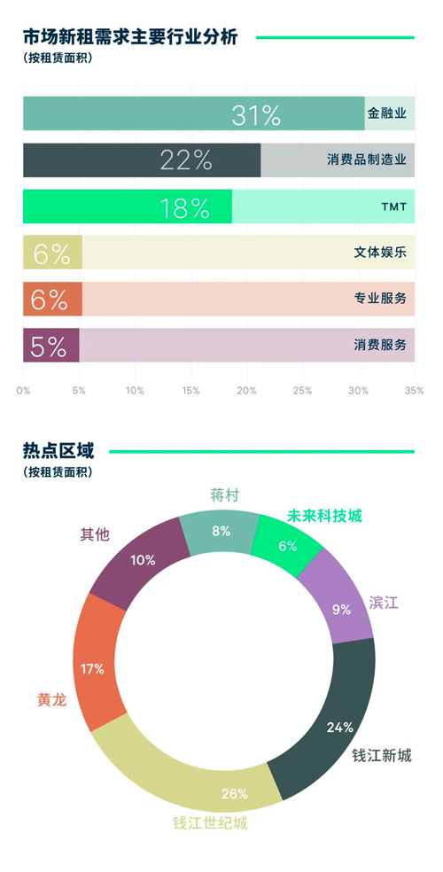 行業(yè)需求方面,2023年全年,以銀行、保險和證券為代表的金融類租戶持續(xù)整合升級搬遷,布點以錢江新城為代表的主要板塊,占比31%,年內(nèi)需求以升級整合為主導(dǎo)。此外,消費品制造業(yè)受某新能源汽車企業(yè)大面積落地影響,需求占比躍升,以22%的占比位居需求次席,除新能源汽車類租戶外,年內(nèi)亦有包括服飾珠寶、食品以及快消品等消費品品類租戶落址。TMT類租戶需求穩(wěn)健,占比18%,主要以直播電商需求活躍于直播相關(guān)熱點板塊。值得一提的是,消費服務(wù)類年內(nèi)需求活躍,醫(yī)美和教育留學(xué)相關(guān)品類租戶需求顯著。