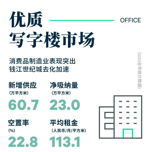 2023年第四季度,杭州寫字樓市場共錄得三個新項目交付,分別為位于武林板塊的杭州中心、錢江世紀城板塊的望朝中心以及濱江板塊的圓倫大廈,總計14.9萬平方米。至此2023年全年杭州寫字樓市場共錄得60.7萬平方米新增供應,供應量創近三年新高,優質項目的入市不僅帶動市場租賃交易活躍度,同時也推動相關商務區板塊的整體樓宇品質的躍升提檔。隨著下半年幾宗總部租賃交易的定錘,全年凈吸納量回升至23.0萬平方米,是去年的兩倍。