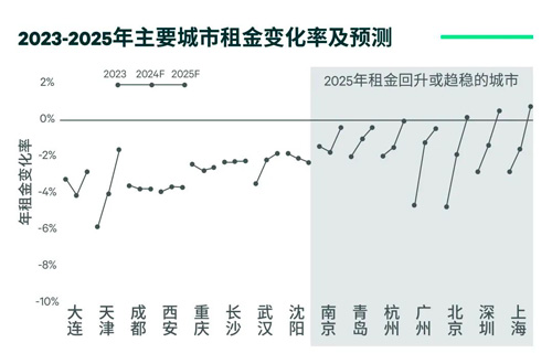 與此相反,空置率較高或需求補給疲軟的華北及中西部二線城市2024年租金跌幅仍然較大,止跌企穩還需要更長的周期。