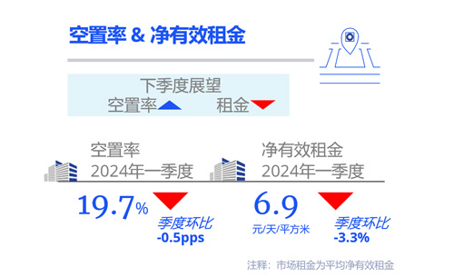 2024年第一季度,受春節假期影響,上海辦公樓市場暫無新增供應入市,空置率因此環比小幅下降至19.7%;整體市場的需求動力在本季度尚未體現,全市寫字樓整體租金環比降至人民幣6.9元每平米每天。