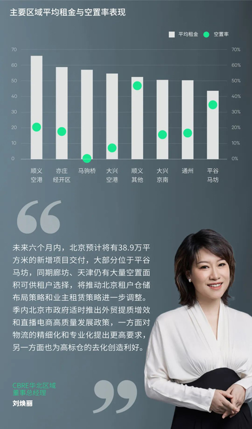 北京長期處于高位的租金水平自2010年以來首次走低,平均租金同樣本比環比下降1.4%至每月每平方米56.5元,其中平谷大幅調整,可租賃空間較充裕的順義其他、通州、大興京南等子市場亦有小幅下滑,而順義空港、馬駒橋等剛需型核心市場則相對穩定。