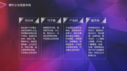 展覽會預計布局寫字樓和產業園兩大主題館,包含寫字樓、產業園、綜合體、服務商在內的4大展區。