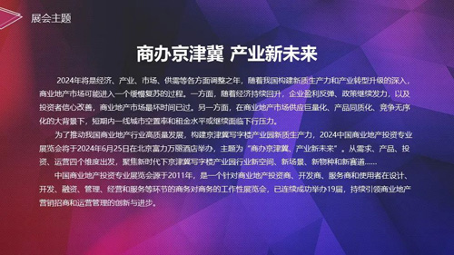 2024年是京津冀協(xié)同發(fā)展十周年。十年來,京津冀協(xié)同發(fā)展取得了豐碩成果。為了推動京津冀商業(yè)地產(chǎn)行業(yè)新質(zhì)生產(chǎn)力發(fā)展,推進(jìn)京津冀商業(yè)地產(chǎn)市場生態(tài)構(gòu)建,展示京津冀商業(yè)地產(chǎn)市場建設(shè)成果,第二十屆EXPO COSS中國商業(yè)地產(chǎn)投資專業(yè)展覽會(EXPO COSS2024)將于6月25日在北京富力萬麗酒店舉辦,主題為“商辦京津冀,產(chǎn)業(yè)新未來”。從需求、產(chǎn)品、渠道、運(yùn)營四個維度出發(fā),聚焦京津冀協(xié)同發(fā)展十年背景下寫字樓產(chǎn)業(yè)園的新需求、新產(chǎn)品、新渠道、新運(yùn)營……