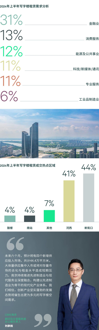 需求方面,金融行業租賃需求穩居首位,占比31%。保險機構在新街口板塊鎖定次新樓宇完成搬遷置換,位于河西板塊的證券、銀行及期貨類租戶升級搬遷需求顯著。消費服務行業位居次席,占比13%,尤以教育機構租賃表現最為活躍,主要選址于新街口板塊核心區域項目,新設與擴租勢頭強勁。能源及公共事業類企業租賃需求表現穩健,能源及水電相關行業租戶于多個板塊完成大面積搬遷或擴租。來自律所及會計事務所等專業服務業租賃需求在河西板塊持續活躍。